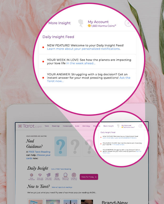 We're thrilled to let you know about a brand-new feature on Tarot.com that we think you're going to love! It's called your Daily Insight Feed, and this personalized notification hub will keep you up to date on the most important news and cosmic energies you'll want to know about. Never miss out on important things like: